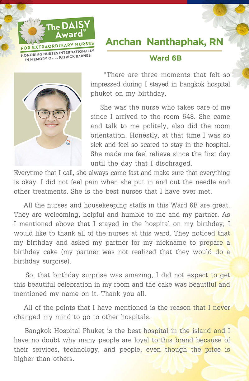 لذلك، شارك مستشفى بانكوك بوكيت في المشروع الممول من مؤسسة ديزي التي أنشأت عائلة بارنز في عام1999م تخليداً لذكرى Patrick Barnes الذي عانى من نقص الصفيحات الدموية. خلال فترة إقامته في المستشفى لمدة ثمانية أسابيع، تلقى باتريك رعاية تمريضية ممتازة كما لو كان أحد أفراد الأسرة. لقد شعر باتريك بالتفاني والتعاطف الرائع لكل الممرضين و الممرضات، مما يجعل وعائلته يشعرون بالامتنان حتى النهاية.