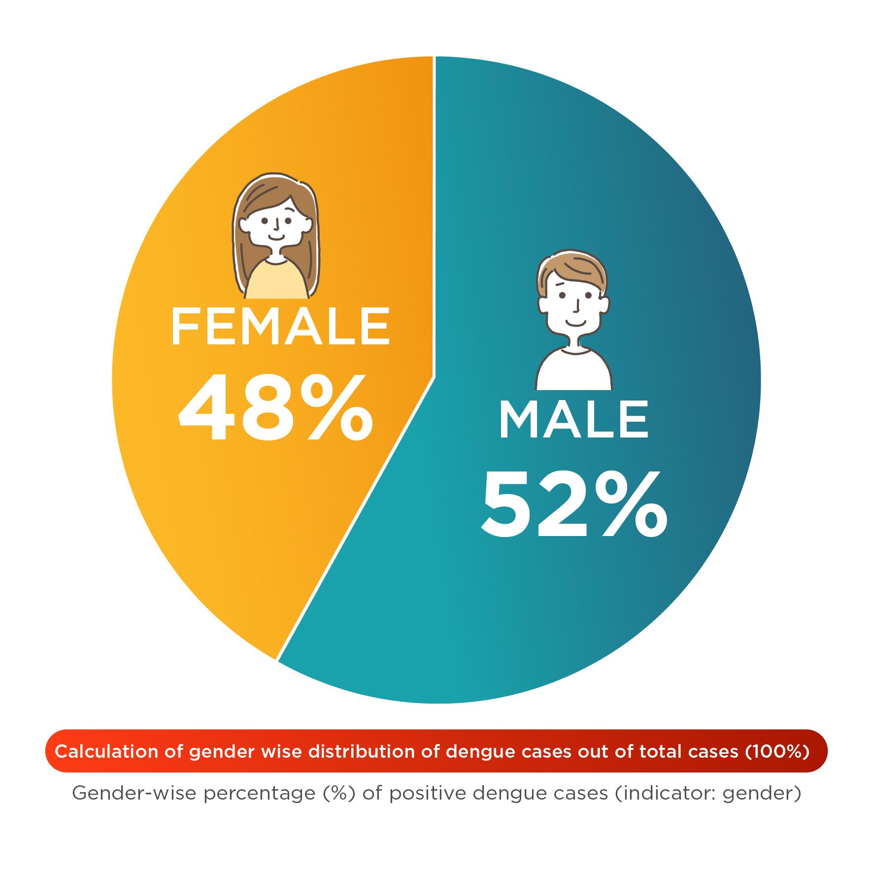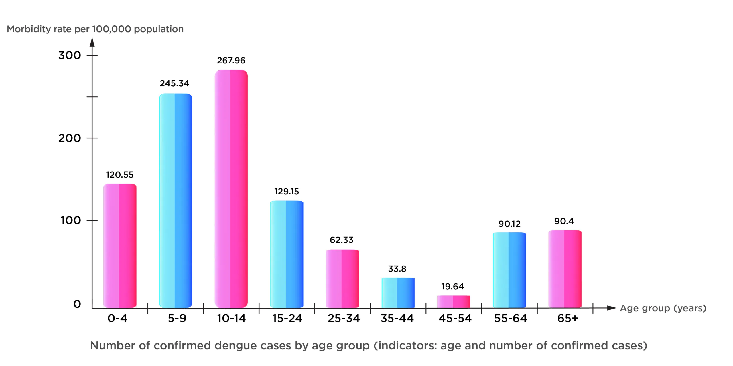According to statistics on the dengue fever outbreak in southern Thailand, the highest number of dengue cases is observed the age group of 10-14 years old, followed by 5-9 years. In addition, dengue fever is more common among men than women; of total confirmed cases in the southern region, 52% of patients were men and 48% were women.