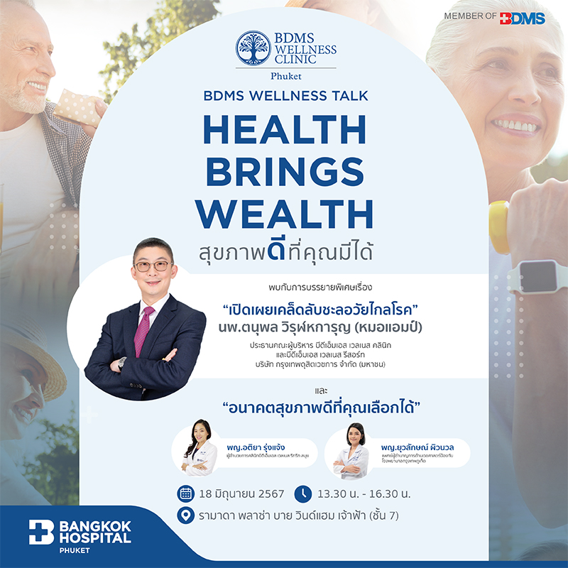 BDMS WELLNESS TALK : HEALTH BRINGS WEALTH สุขภาพดีที่คุณมีได้ 6 มิถุนายน 25676 มิถุนายน 2024Pattama Kokittipongข่าวสารจากโรงพยาบาลกรุงเทพภูเก็ต, ข่าวกิจกรรม