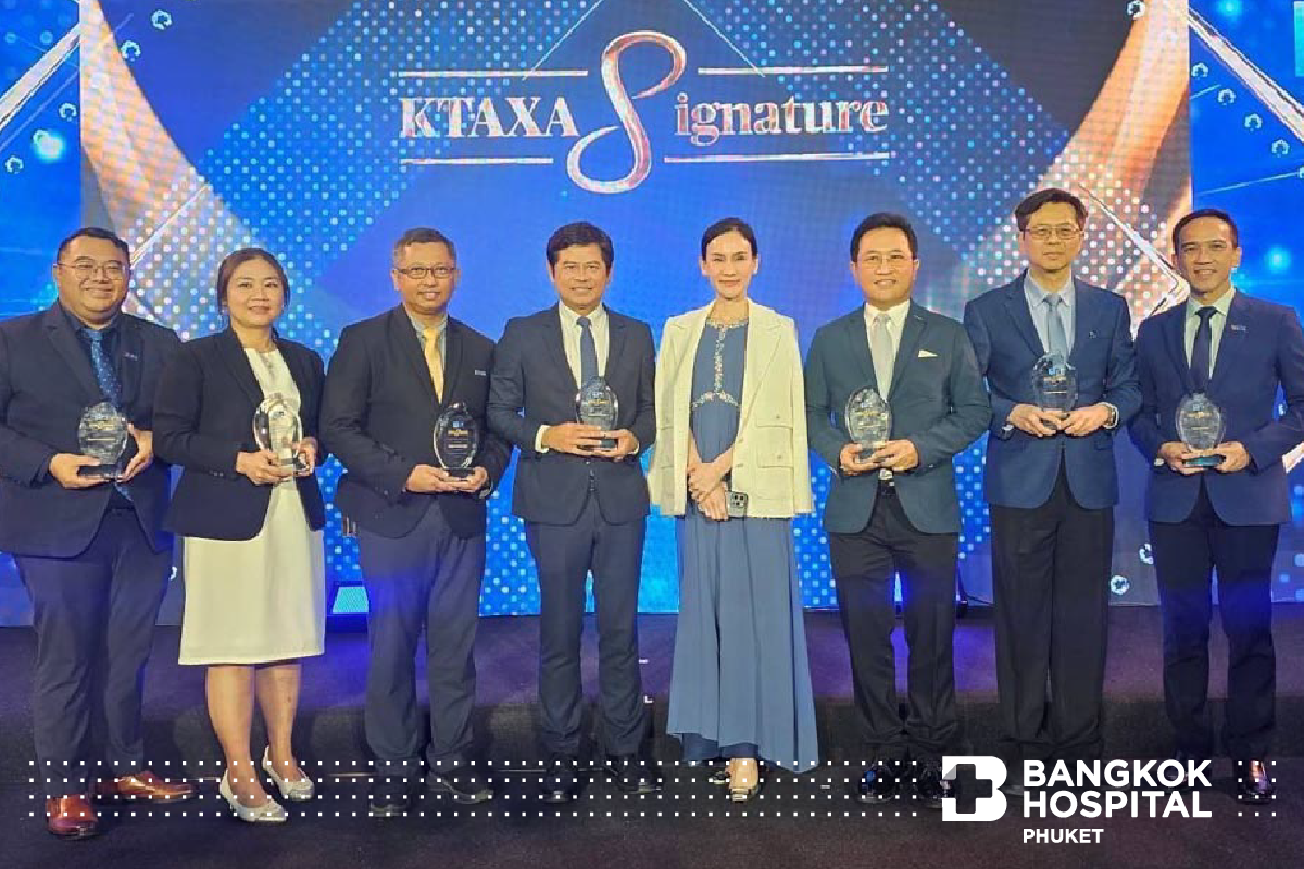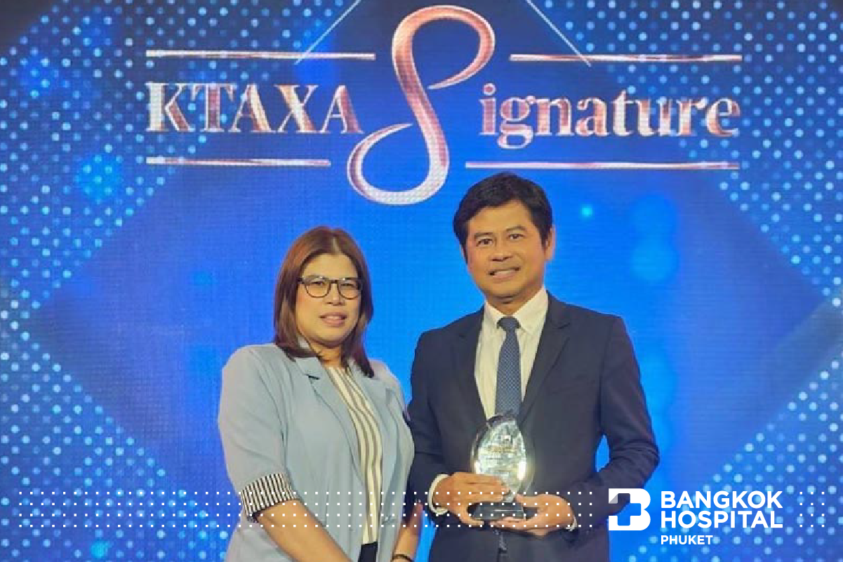 นายแพทย์ณรงค์ฤทธิ์ ฮาวรังษี รองประธานคณะผู้บริหารกลุ่ม 6 และผู้อำนวยการโรงพยาบาลกรุงเทพภูเก็ต พร้อมคุณนิลุบล อำนวยผล หัวหน้าแผนก Utilization Management รับรางวัลในงาน KTAXA Signature Hospital Awards ประจำปี 2566 จัดโดย บริษัท กรุงไทย-แอกซ่า ประกันชีวิต จำกัด (มหาชน)